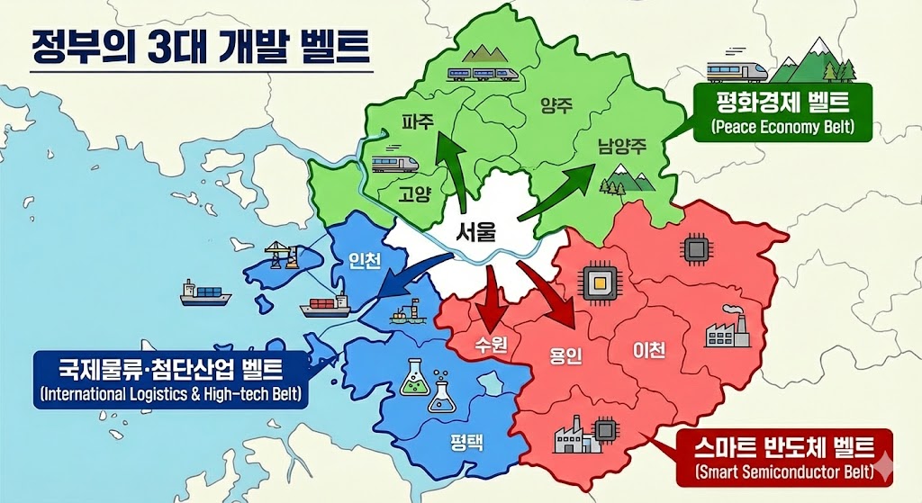 - 평화경제 벨트 (북부): 파주, 고양, 의정부 등입니다. 남북 관계라는 변수가 있지만, GTX-A 개통과 함께 서울 접근성이 획기적으로 개선되며 '베드타운'에서 '자족 도시'로 변모 중입니다.