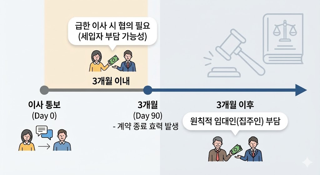 법적으로 보증금 반환 의무는 통보 3개월 뒤에 생깁니다. 만약 여러분이 당장 다음 달에 이사를 가야 해서 집주인에게 "보증금 좀 빨리 빼주세요"라고 요청한다면? 이때 집주인은 **"3개월 뒤에 줄 건데, 일찍 받고 싶으면 복비는 당신이 내시오"**라고 협상을 걸어올 수 있습니다. 이는 법적 의무는 아니지만, 빠른 보증금 회수를 위한 '합의' 차원에서 세입자가 부담하는 경우가 많습니다.