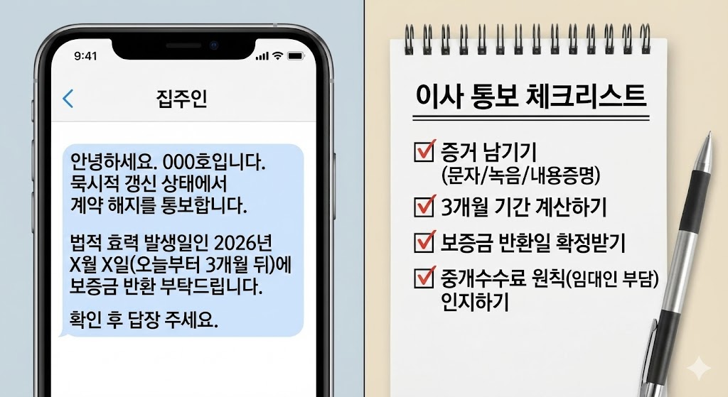 - 문자/카카오톡: "000호 세입자입니다. 묵시적 갱신 상태에서 계약 해지를 통보합니다. 오늘(202X.XX.XX)로부터 3개월 뒤인 XX월 XX일에 보증금 반환 부탁드립니다."라고 보내고 답장을 받으세요.
