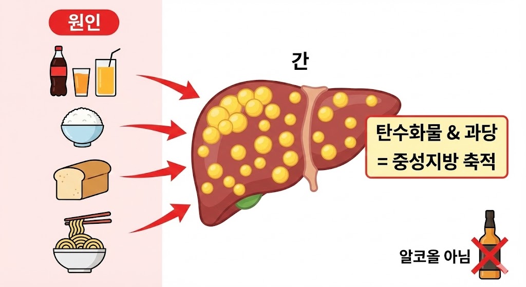의학적으로 비알코올성 지방간의 가장 근본적인 원인은 **'인슐린 저항성(Insulin Resistance)'**입니다.