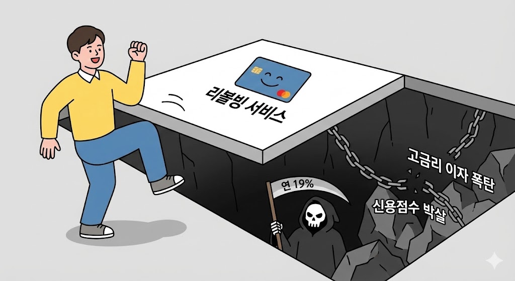 아래 이미지는 리볼빙이라는 달콤한 유혹 뒤에 숨겨진 고금리 이자와 신용 하락의 함정을 직관적으로 보여줍니다.