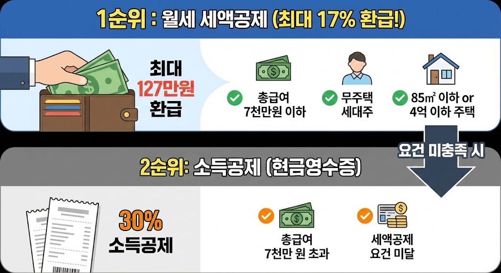 아래 이미지는 월세 세액공제와 소득공제의 차이점과 우선순위를 한눈에 보여줍니다.