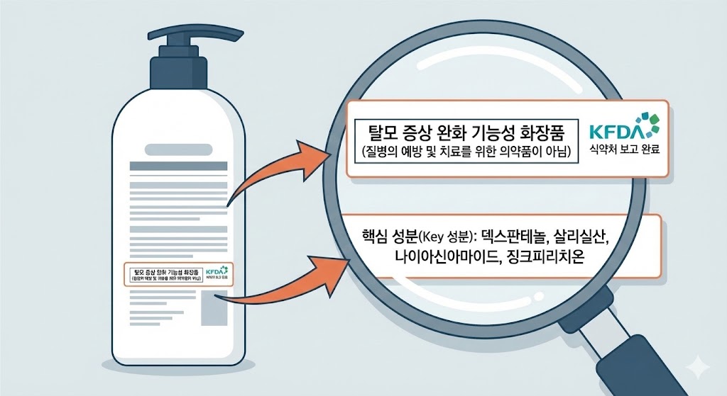단순히 "탈모 방지", "모발 굵기 증가"라고 적힌 광고 문구가 아니라, 제품 용기 뒷면에 **식약처 보고 완료(기능성 화장품)**라는 문구나 마크가 반드시 있어야 합니다. 이 마크가 없다면 아무리 비싼 한방 성분을 넣었어도 그냥 '세정제'일 뿐입니다.