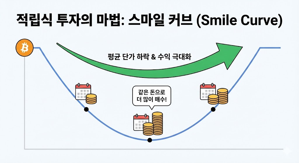 결과적으로 내가 보유한 비트코인의 평단가는 낮아지고 수량은 늘어납니다. 이후 가격이 조금만 반등해도, 막대한 수량 덕분에 수익률이 폭발적으로 증가합니다. 이것이 바로 하락장을 웃으면서 버티는 '스마일 커브(Smile Curve)' 효과입니다.