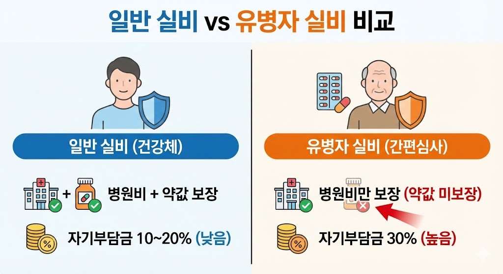가장 큰 차이점입니다. 일반 실비는 병원비와 약값을 모두 보장하지만, 유병자 실비는 병원에서 쓴 치료비(입원/통원)만 보장하고, 약국에서 짓는 약값은 보장하지 않습니다.
