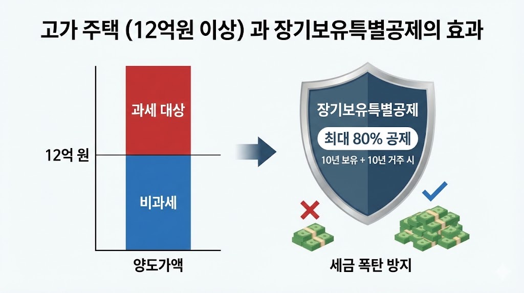 아래 이미지는 양도가액 12억 원을 초과하는 고가 주택의 양도세 계산 구조와 장기보유특별공제의 효과를 보여주는 다이어그램입니다. 왼쪽 그래프는 12억 원까지는 비과세, 초과분만 과세 대상임을 나타내고, 오른쪽 방패 아이콘은 '10년 보유 + 10년 거주' 시 최대 80%까지 공제받아 '세금 폭탄'을 막을 수 있음을 시각적으로 표현합니다.