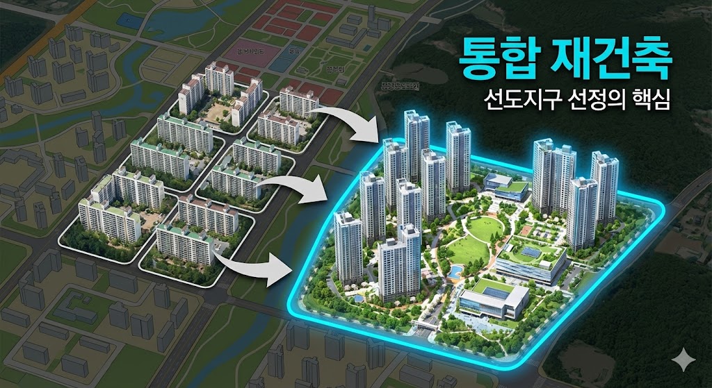 아래 이미지는 여러 개의 노후된 소규모 아파트 단지가 하나로 통합되어 대규모의 현대적인 아파트 단지로 변모하는 과정을 보여주는 인포그래픽입니다. '통합 재건축'이 선도지구 선정에 결정적인 역할을 했음을 시각적으로 강조합니다.