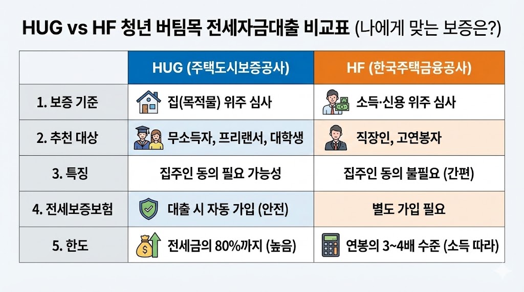 🚀 꿀팁: 소득이 없거나 불안정한 프리랜서, 대학생이라면 무조건 HUG(허그) 버팀목을 노려야 합니다. 반면, 연봉이 높고 재직 기간이 긴 직장인이라면 절차가 간편한 HF가 유리할 수 있습니다.
