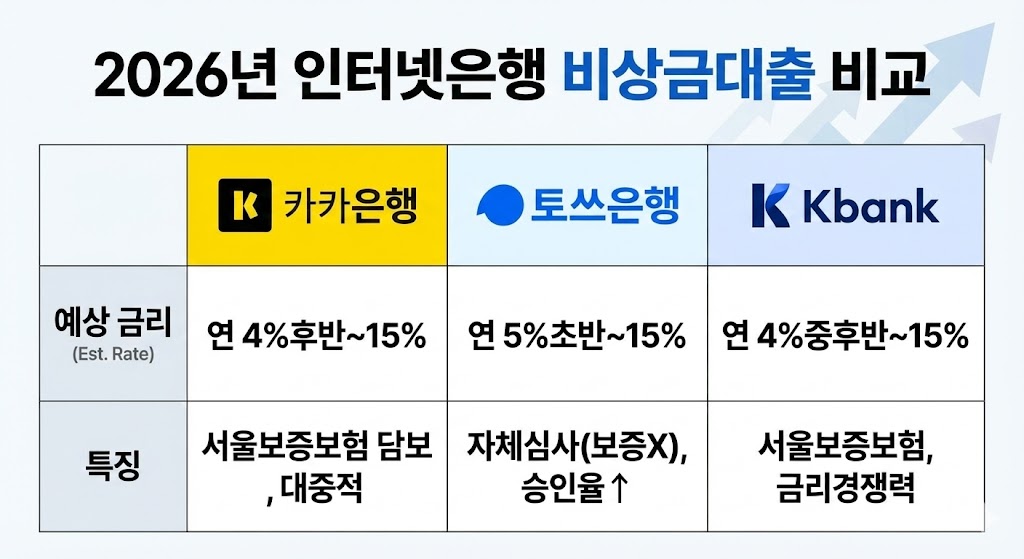 ▲ 2026년 인터넷전문은행 3사(카카오, 토스, 케이뱅크) 비상금대출 예상 금리 및 특징 비교표