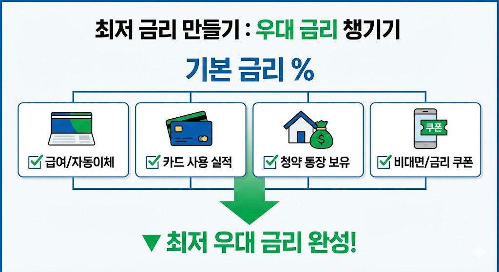 은행이 제시하는 기본 금리에서 '우대 금리(Prime Rate)'를 모두 챙겨야 진정한 최저 금리가 완성됩니다.