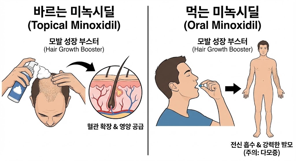 아래 이미지는 바르는 미녹시딜과 먹는 미녹시딜의 작용 원리와 차이점을 알기 쉽게 보여줍니다.