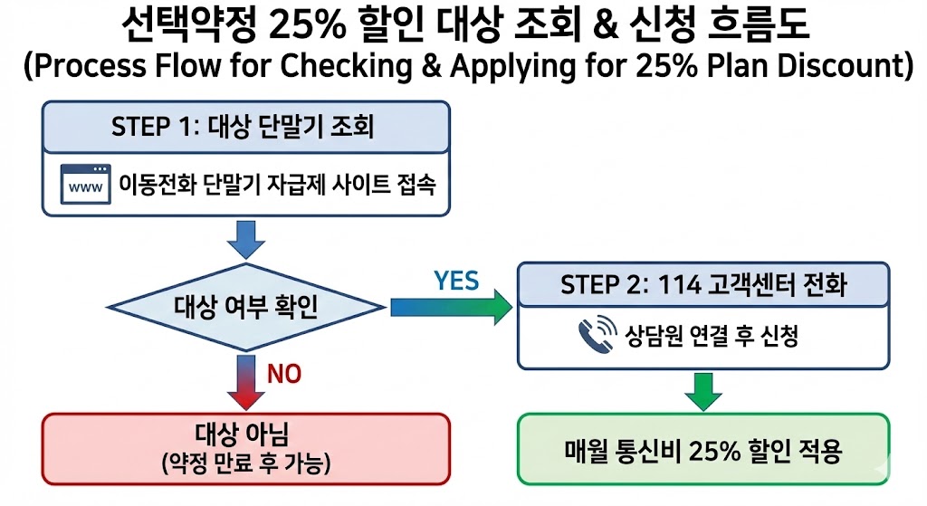 많은 분이 핸드폰을 2년 이상 쓰고도 이 혜택을 놓칩니다. **'선택약정 할인'**은 단말기 지원금(공시지원금)을 받지 않았거나, 약정 기간(24개월)이 만료된 사용자가 1년 또는 2년 약정을 다시 걸면 요금의 25%를 깎아주는 제도입니다.