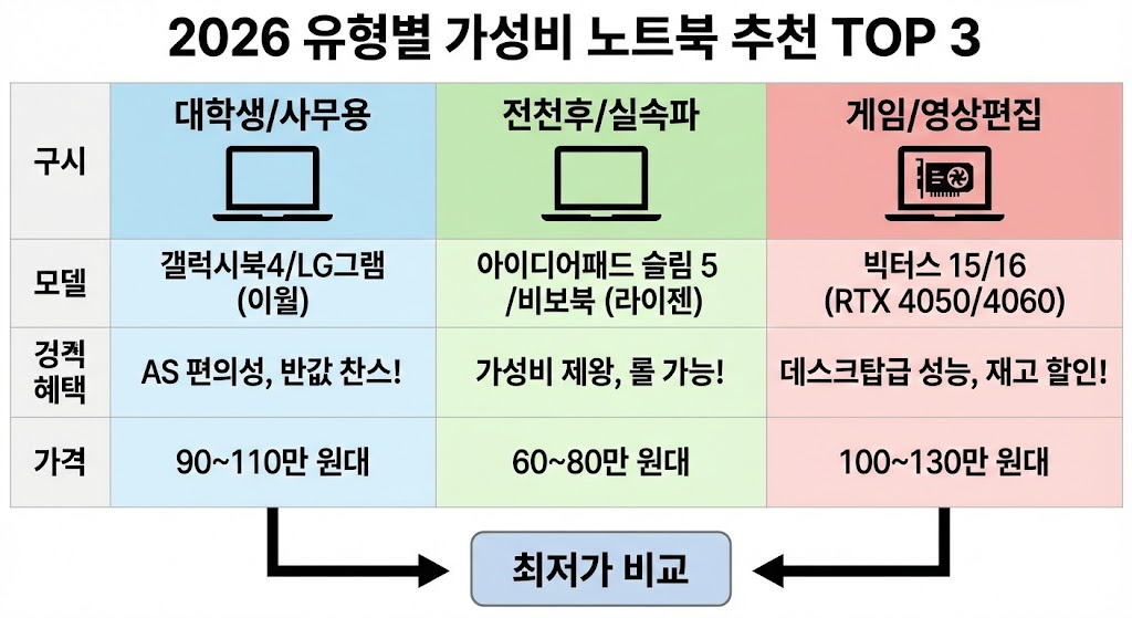아래 이미지는 사용자 유형별로 추천하는 2026년 상반기 가성비 노트북 TOP 3를 비교 정리한 표 형식의 인포그래픽입니다. '대학생/사무용', '전천후/실속파', '게임/영상편집' 세 가지 카테고리로 나누어, 각 유형에 맞는 추천 모델명(예: 갤럭시북4/LG그램 이월, 아이디어패드 슬림 5 등), 주요 혜택(AS 편의성, 가성비 등), 그리고 적정 가격대를 명시했습니다. 하단의 '최저가 비교' 버튼으로 실제 구매 행동을 유도합니다.