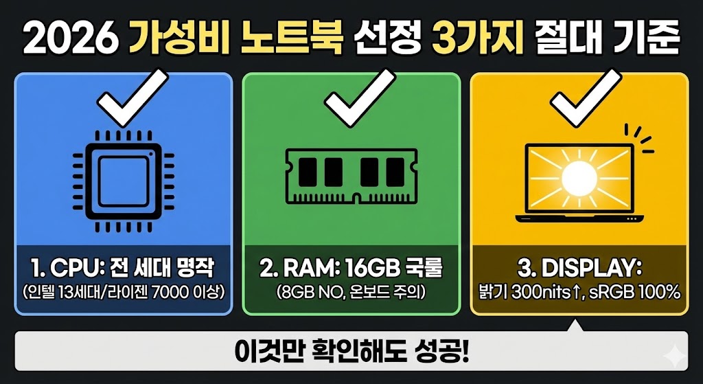 아래 이미지는 2026년 가성비 노트북 구매 시 반드시 확인해야 할 3가지 핵심 기준을 시각화한 인포그래픽입니다. 첫 번째 패널(CPU)은 인텔 13세대 및 라이젠 7000번대 등 전 세대 명작 프로세서를 추천하며, 두 번째 패널(RAM)은 16GB를 최소 기준으로 제시하고 8GB 및 온보드 방식에 대한 주의를 당부합니다. 세 번째 패널(DISPLAY)은 밝기 300nits 이상과 sRGB 100% 색재현율을 필수 조건으로 강조합니다. 하단의 "이것만 확인해도 성공!"이라는 문구로 핵심을 요약합니다.