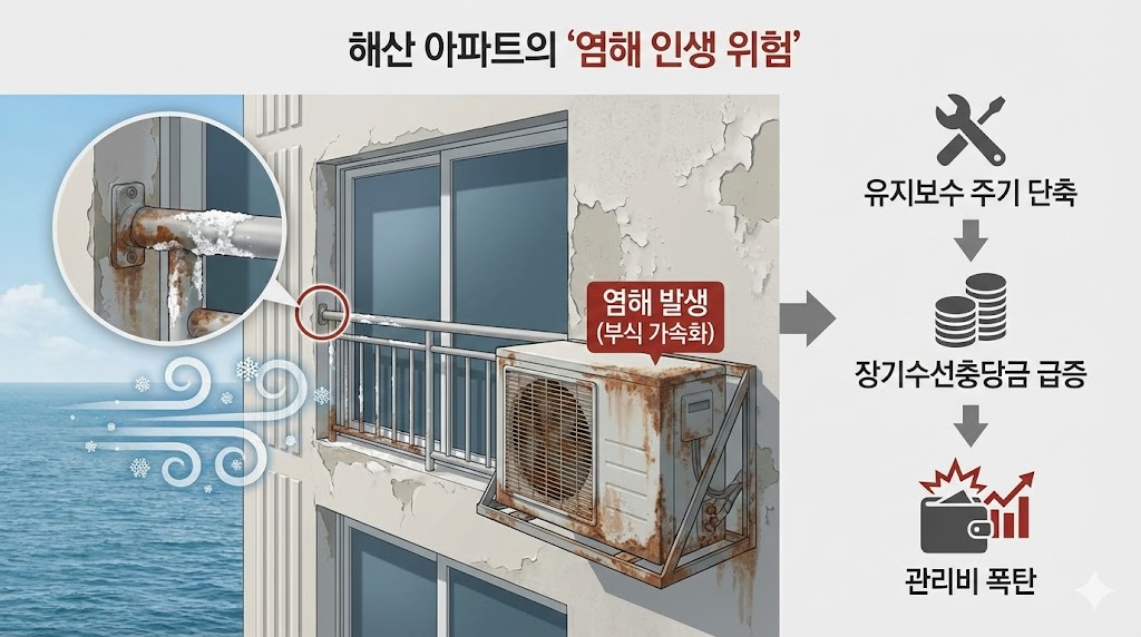 아래 이미지는 바닷가 아파트에서 발생하는 염해 피해의 구체적인 모습과 경제적 파급 효과를 도식화한 인포그래픽입니다. 왼쪽에는 부식된 실외기와 난간을 실제 사진처럼 확대하여 염해의 심각성을 보여주고, 오른쪽에는 이로 인해 유지보수 주기가 단축되고 관리비 폭탄으로 이어지는 인과관계를 명확한 흐름도로 표현했습니다.