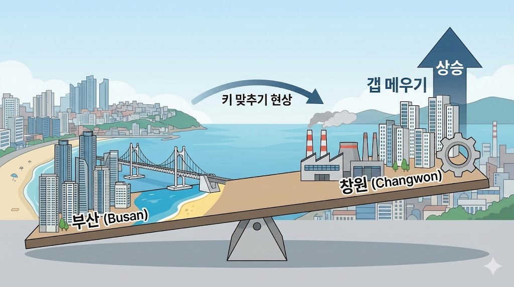 아래 이미지는 부산과 창원 두 도시의 집값 흐름을 '시소'에 비유한 인포그래픽입니다. 왼쪽의 부산(해운대 등)과 오른쪽의 창원(공단, 신축 아파트)을 배치하고, 현재 창원의 상승세가 두드러지며 가격 격차(갭)를 메우고 있는 '키 맞추기 현상'을 시각적으로 표현했습니다.
