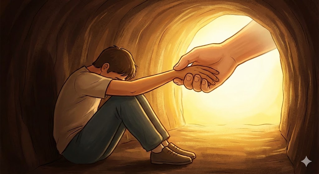 아래 이미지는 어두운 터널 속에 절망적으로 앉아있는 사람에게, 밖에서 따뜻하고 거대한 손길(정부의 긴급복지지원)이 내밀어지는 감동적인 일러스트입니다.
