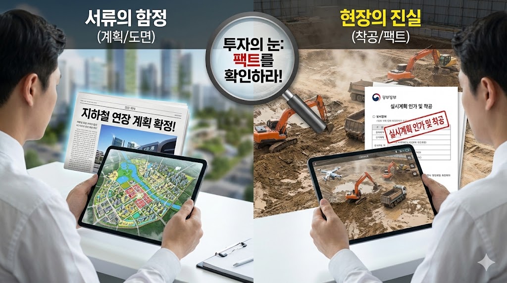 아래 이미지는 성공적인 투자를 위해 계획(서류/도면)에 현혹되지 않고, 실제 현장(착공/팩트)을 확인해야 함을 강조하는 인포그래픽입니다. 왼쪽은 화려한 기사와 조감도만 보는 '서류의 함정'을, 오른쪽은 실제 공사 현장과 실시계획 인가 서류를 확인하는 '현장의 진실'을 보여주며 투자자의 올바른 자세를 제시합니다.