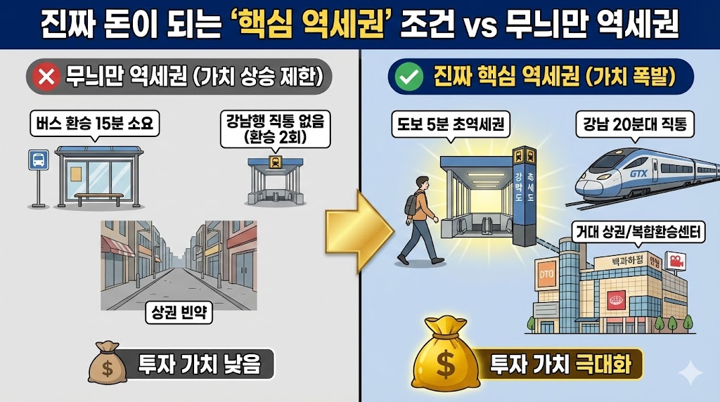 아래 이미지는 무늬만 역세권인 곳과 진짜 가치가 폭발하는 핵심 역세권의 조건을 명확하게 비교하는 인포그래픽입니다. 왼쪽에는 버스 환승이 필요하고 강남 접근성이 떨어지며 상권이 빈약한 '가짜 역세권'의 모습을 담았습니다. 오른쪽에는 도보 5분 이내의 초역세권, 강남 20분대 직통 연결(GTX 등), 그리고 거대한 복합환승센터와 상권을 품은 '진짜 핵심 역세권'의 모습을 대조적으로 보여주며 투자 가치의 차이를 강조합니다.