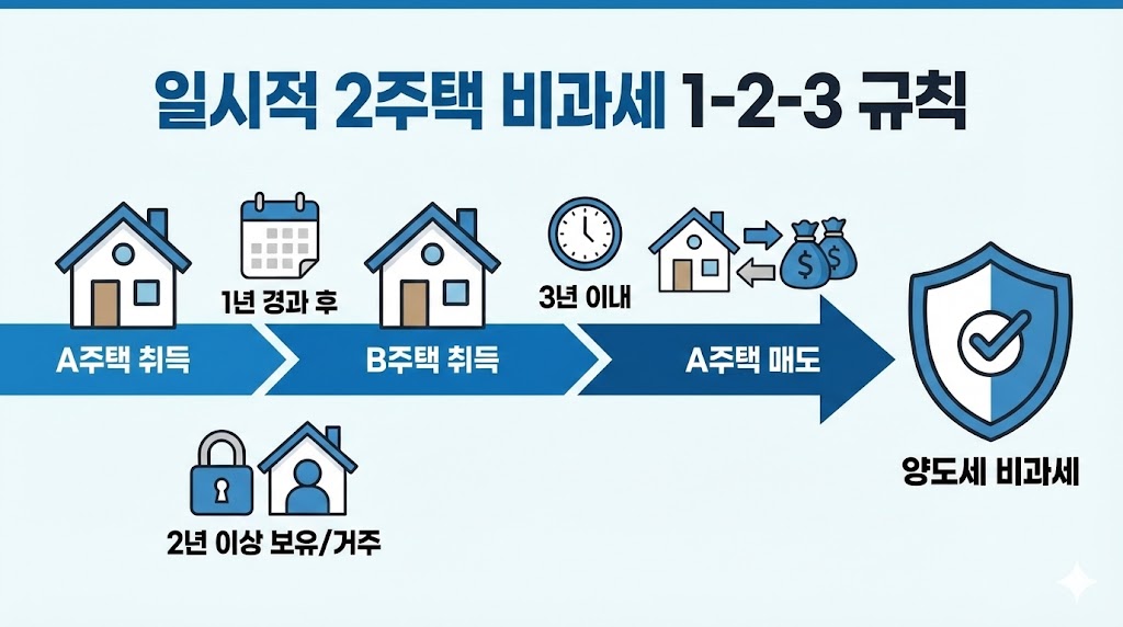 우리가 상급지로 이사를 하려면 잠깐이나마 집이 2채가 되는 '일시적 2주택자' 상태를 거치게 됩니다. 이때 나라에서 "이사는 가야 하니, 억울하지 않게 세금을 안 매길게(비과세)!"라고 인정해 주는 마법의 공식이 바로 **'1·2·3 법칙'**입니다. 이 순서를 하나라도 틀리면 세금 폭탄이 떨어집니다.