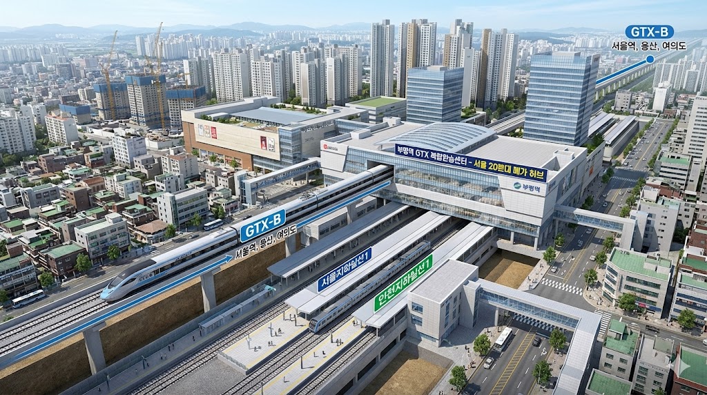 - 서울 핵심 업무지구 20분대 주파: 부평역에서 GTX-B를 타면 서울 여의도, 용산, 서울역까지 20분대에 주파가 가능해집니다. 이는 물리적인 거리를 지워버리고 부평을 완벽한 서울 핵심 생활권으로 편입시키는 강력한 혁명입니다.