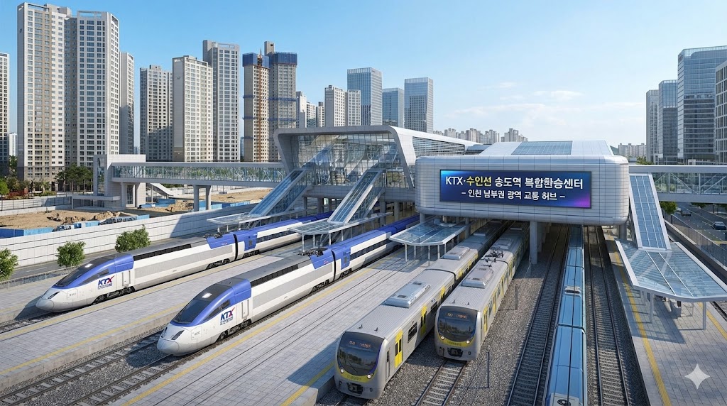 아래 이미지는 KTX 인천발 노선과 수인분당선이 만나는 송도역 복합환승센터의 미래 비전을 보여주는 조감도입니다. KTX 열차와 수인선 열차가 함께 정차해 있는 모습과 역 주변으로 진행 중인 도시개발 사업을 시각화하여, 단순한 동네 전철역에서 인천 남부권의 핵심 광역 교통 허브로 탈바꿈할 송도역의 역동적인 변화를 직관적으로 전달합니다.