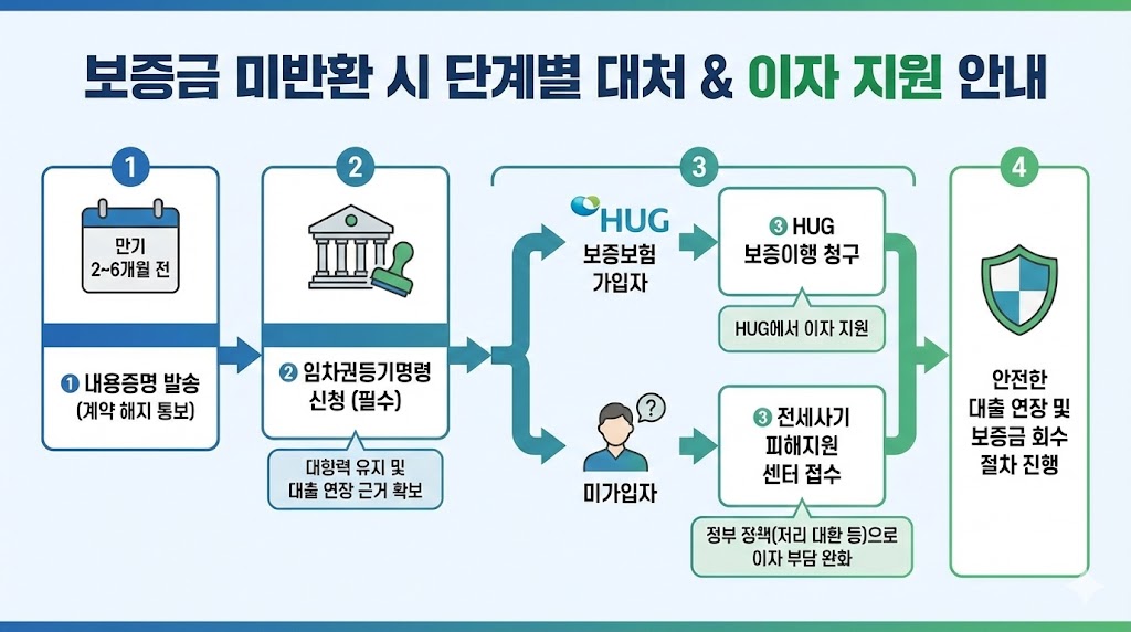 아래 이미지는 보증금 미반환 사고 발생 시 임차인이 취해야 할 필수적인 법적 절차와 대출 이자 부담을 완화받을 수 있는 방법을 시간 순서대로 정리한 플로우차트입니다. 만기 전 내용증명 발송부터 만기 직후 임차권등기명령 신청, 그리고 보증보험 가입 여부에 따른 HUG 이행청구 또는 전세사기 피해접수까지의 과정을 명확한 화살표와 아이콘으로 보여줍니다.