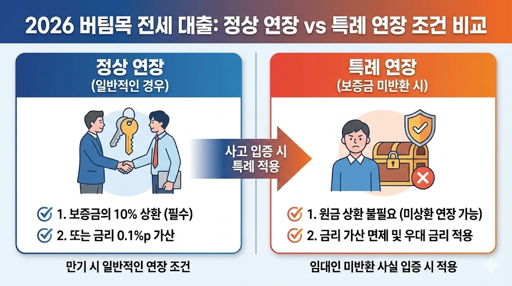 아래 이미지는 버팀목 전세 대출의 일반적인 만기 연장 조건과 집주인의 보증금 미반환으로 인한 '특례 연장' 조건을 한눈에 비교할 수 있도록 디자인한 인포그래픽입니다. 왼쪽의 파란색 패널은 정상 연장 시 필요한 '보증금 10% 상환 또는 금리 인상' 조건을 보여주고, 오른쪽의 주황색 패널은 보증금 사고 발생 시 적용되는 '원금 미상환 및 금리 페널티 면제'라는 파격적인 혜택을 직관적인 아이콘과 함께 대조적으로 보여줍니다. 중앙의 화살표는 사고 입증 시 특례가 적용됨을 명확히 합니다.