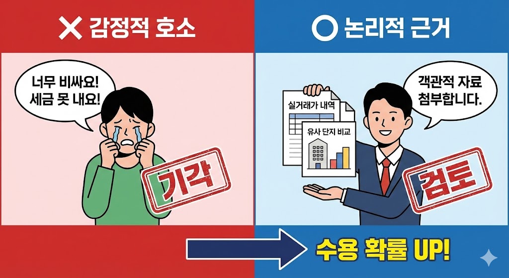 단순히 "세금 내기 싫으니 깎아주세요"라고 쓰면 100% 기각됩니다. 감정평가사가 납득할 만한 **'객관적 근거'**를 제시해야 합니다.