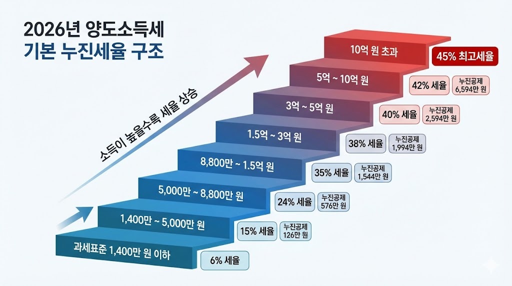 아래 이미지는 2년 이상 보유 시 적용되는 2026년 양도소득세 기본 누진세율을 계단식 구조로 표현한 인포그래픽입니다. 과세표준(수익)이 커질수록 계단을 올라가며 세율이 6%에서 최대 45%까지 높아지는 구조를 직관적으로 보여줍니다. 각 구간별 적용 세율과 계산을 돕는 '누진공제액'이 함께 명시되어 있습니다.