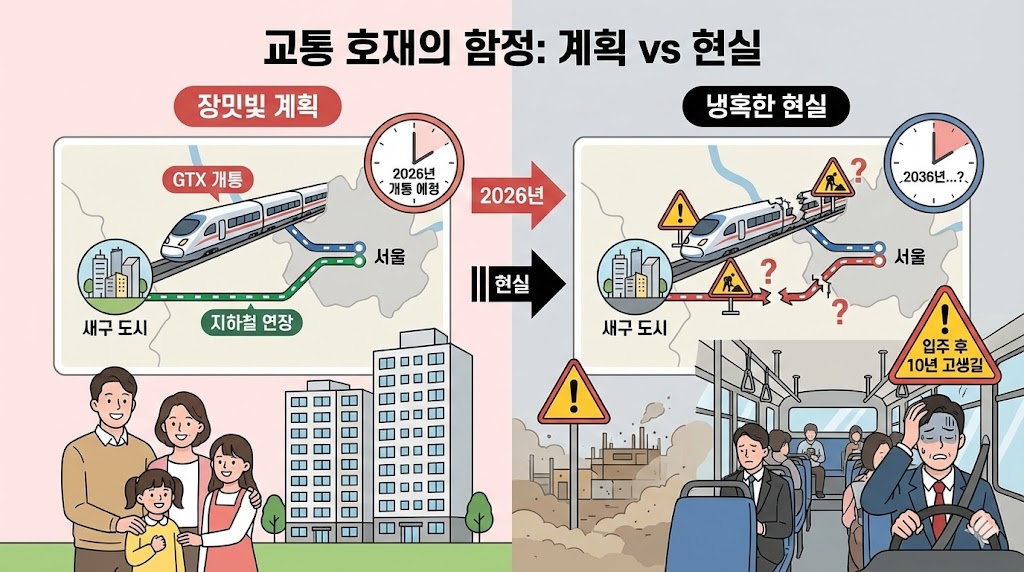 아래 이미지는 신도시의 장밋빛 교통 계획(GTX 개통 예정)과 현실적인 개통 지연으로 인한 입주민의 고통을 대비하여 보여주는 인포그래픽입니다.