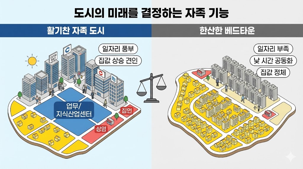 아래 이미지는 일자리가 풍부한 활기찬 자족 도시와 주거 기능만 있는 한산한 베드타운의 모습을 대조적으로 보여주는 인포그래픽입니다.