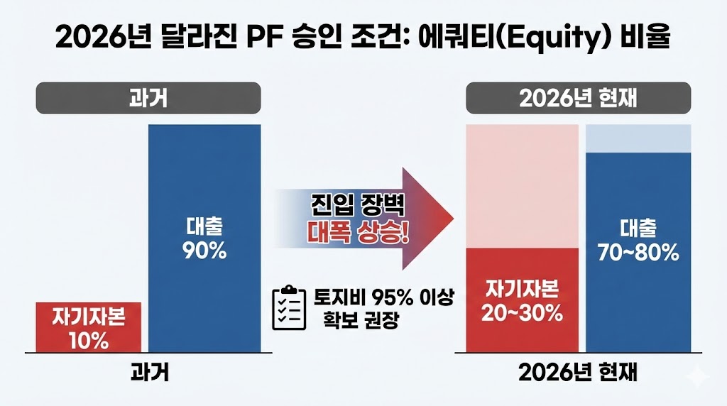 아래 이미지는 PF 대출 승인을 위한 자기자본(에쿼티) 비율 요구 조건의 변화를 보여주는 인포그래픽입니다. 과거에는 자기자본 10%로 가능했지만, 2026년 현재는 20~30%로 대폭 상향되었음을 시각적으로 비교합니다. '진입 장벽 대폭 상승!'이라는 문구와 '토지비 95% 이상 확보 권장'이라는 체크리스트를 통해 강화된 조건을 강조합니다.