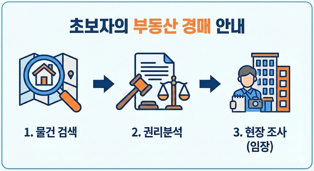 아래 이미지는 부동산 경매의 핵심 절차인 '1. 물건 검색', '2. 권리분석', '3. 현장 조사(임장)'를 직관적인 아이콘과 함께 흐름도로 표현한 인포그래픽입니다. 초보자가 전체적인 과정을 한눈에 이해할 수 있도록 돕습니다.