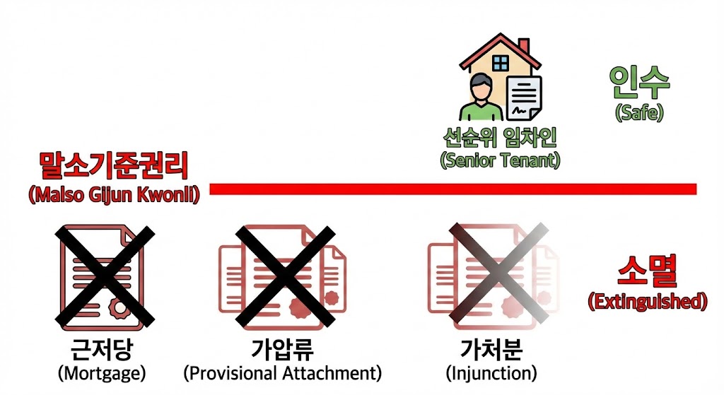 아래 이미지는 초보자가 가장 어려워하는 권리분석의 핵심 개념인 '말소기준권리'를 시각적으로 설명하는 이미지입니다. 붉은색 선(말소기준권리)을 기준으로 그 아래의 권리들(근저당, 가압류 등)은 '소멸'되고, 그 위의 권리(선순위 임차인)는 '인수'되어 안전하다는 것을 직관적으로 보여줍니다.