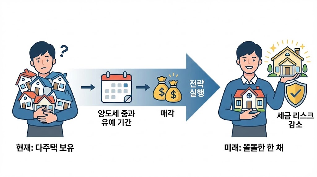아래 이미지는 강화되는 규제 속에서 다주택자가 살아남기 위한 현실적인 전략을 단계별 흐름도로 보여주는 가로형 인포그래픽입니다. 여러 채의 집을 가진 현재의 불안한 상태에서 '양도세 중과 유예 기간'을 활용해 비핵심 자산을 매각하고, 최종적으로 세금 리스크가 적은 '똘똘한 한 채'를 보유한 안정적인 미래로 나아가는 과정을 명확하게 제시합니다.