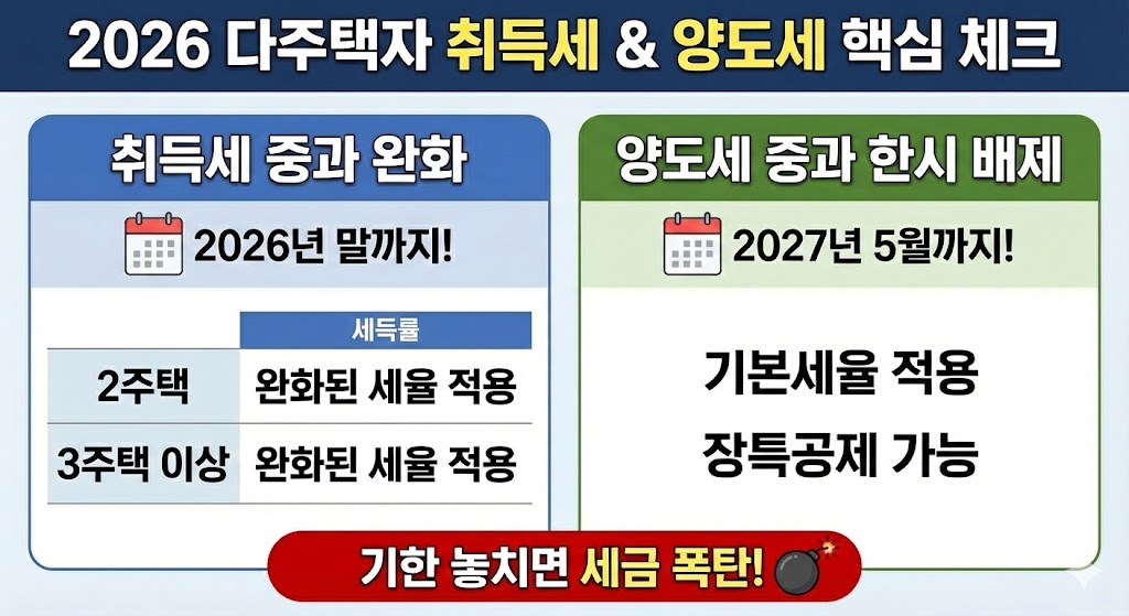 아래 이미지는 2026년 다주택자에게 적용되는 취득세와 양도세의 핵심 변화를 요약한 인포그래픽입니다. 왼쪽은 '취득세 중과 완화'가 2026년 말까지 연장되었음을 보여
