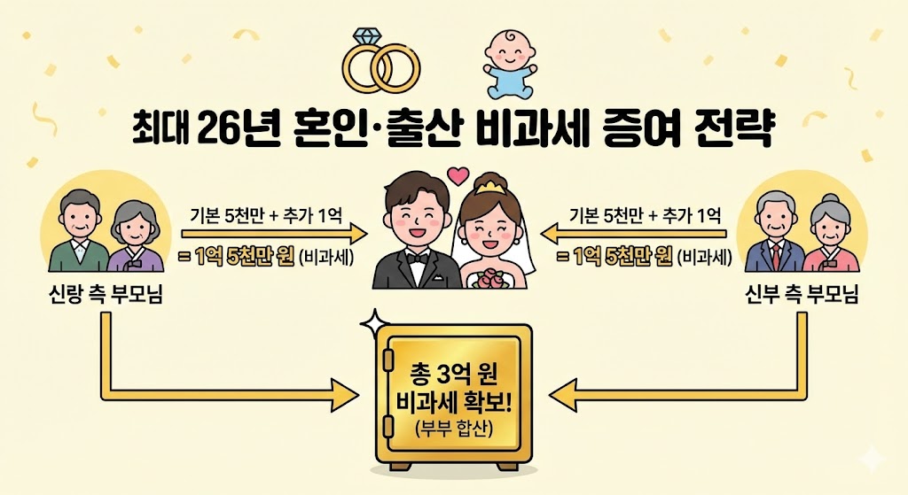 결혼과 출산은 축복이자 최고의 절세 기회입니다. 양가 부모님의 도움으로 마련한 3억 원의 '세금 없는 종잣돈'은 신혼부부의 내 집 마련을 앞당기는 강력한 무기가 됩니다.