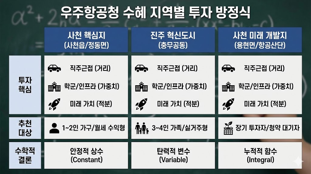 아래 이미지는 사천 우주항공청(KASA)을 중심으로 거리와 인프라, 미래 가치에 따라 나눈 3가지 수혜 구역(사천읍/정동면, 진주 혁신도시, 용현면/항공산단)을 직관적인 지도로 표현했습니다. 각 구역을 직주근접의 '상수', 인프라의 '가중치', 미래 가치의 '적분'이라는 수학적 개념과 연결하여 시각화했습니다.