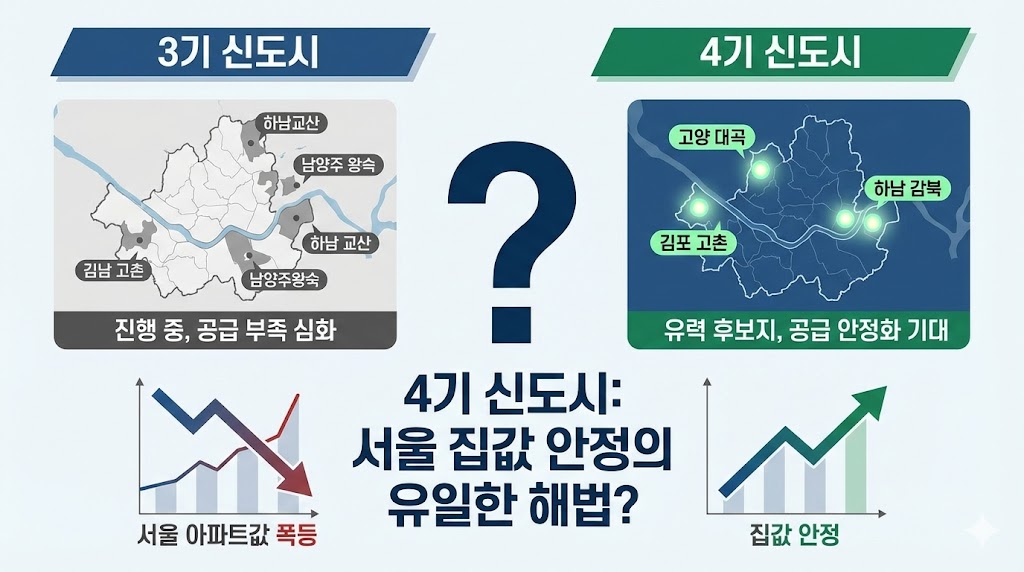 아래 이미지는 3기 신도시의 현재 상황과 공급 부족으로 인한 서울 아파트값 폭등 현상, 그리고 4기 신도시가 공급 안정화와 집값 안정을 가져올 것이라는 기대감을 대조적으로 보여주는 인포그래픽입니다. 중앙의 큰 물음표를 통해 4기 신도시가 유일한 해법일지 독자에게 질문을 던지며 흥미를 유발합니다.