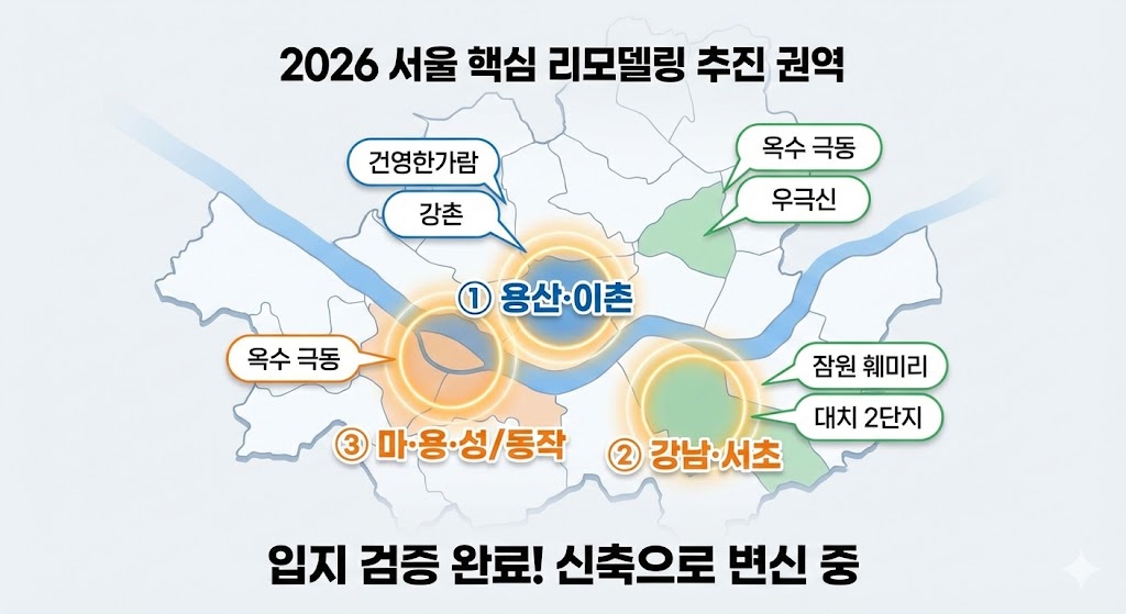 아래 이미지는 2026년 서울의 주요 리모델링 추진 권역 3곳(①용산·이촌, ②강남·서초, ③마·용·성/동작)을 지도 위에 표시한 인포그래픽입니다. 각 권역별로 건영한가람, 잠원 훼미리, 옥수 극동 등 대표적인 알짜 단지명을 말풍선으로 명시하여, 핵심 투자처를 직관적으로 보여줍니다.