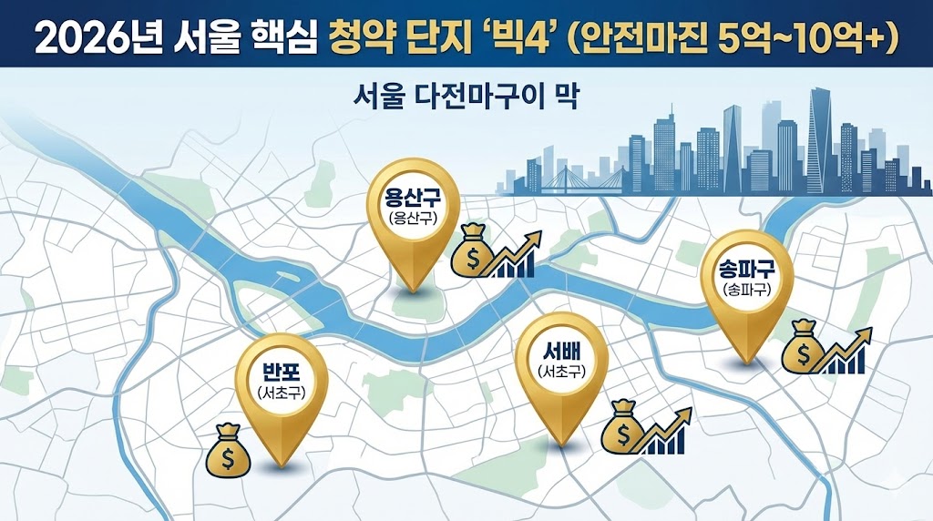 아래 이미지는 서울 지도 위에 2026년 핵심 분양 단지인 반포, 방배, 한남, 송파 4곳을 하이라이트한 인포그래픽입니다. 각 지역에 핀(Pin)이 꽂혀 있고, 그 옆에는 '안전 마진(Safety Margin)'을 상징하는 돈다발(Money bag) 아이콘과 상승하는 그래프가 그려져 있어 투자가치가 높음을 직관적으로 보여줍니다.