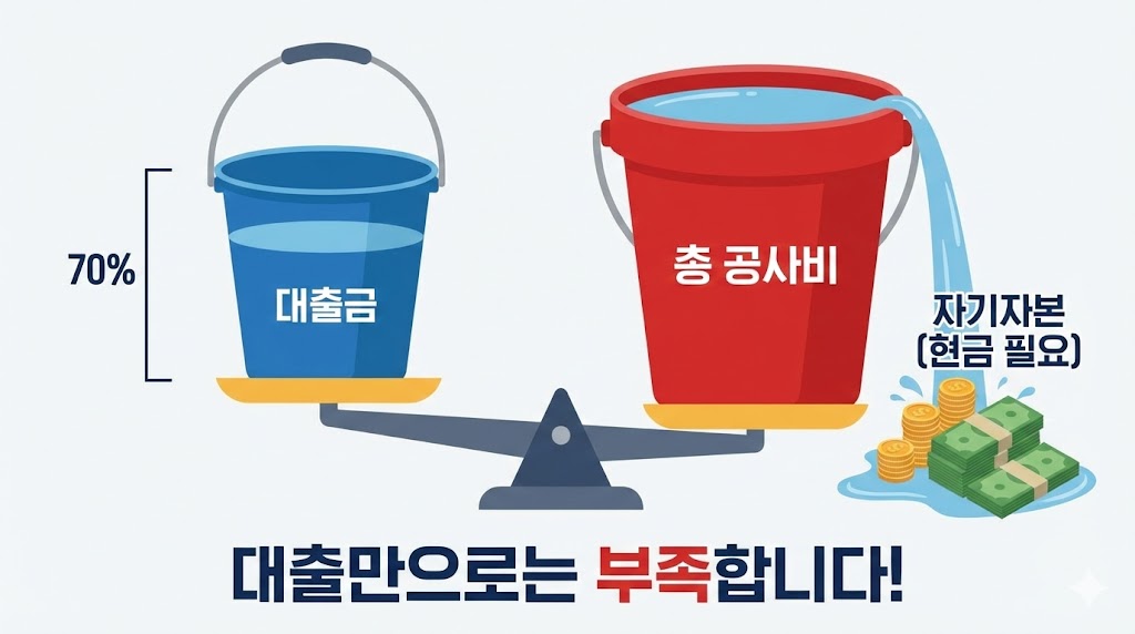 아래 이미지는 은행 대출만으로는 공사비 전체를 감당할 수 없다는 사실을 직관적인 비유로 표현한 인포그래픽입니다. '대출금' 물동이는 총 공사비의 일부(약 70%)만 채울 수 있고, 넘치는 '총 공사비'는 결국 건축주의 '자기자본(현금)'으로 메워야 한다는 점을 저울과 물 넘침 효과를 통해 강조했습니다.