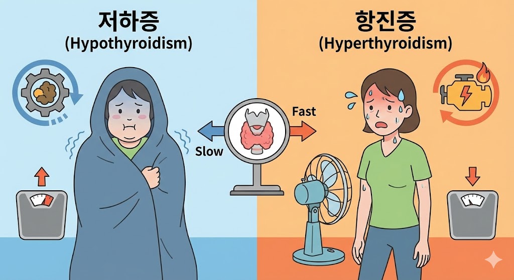 가장 먼저 확인해야 할 것은 내 몸의 '속도'입니다. 갑상선 기능 저하증은 엔진이 꺼져가는 것이고, 항진증은 엔진이 과열되는 것입니다. 미세한 차이를 구별하는 것이 치료의 시작입니다.