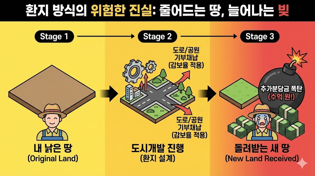 아래 이미지는 도시개발사업의 '환지 방식'이 가진 리스크를 직관적인 인포그래픽으로 표현했습니다. 개발 과정에서 도로와 공원 조성을 위해 내 땅의 일부를 내어주는 '감보율'로 인해 돌려받는 새 땅의 면적이 줄어들고, 사업비 증가로 인한 '추가분담금 폭탄'이 발생할 수 있음을 단계별로 보여줍니다.