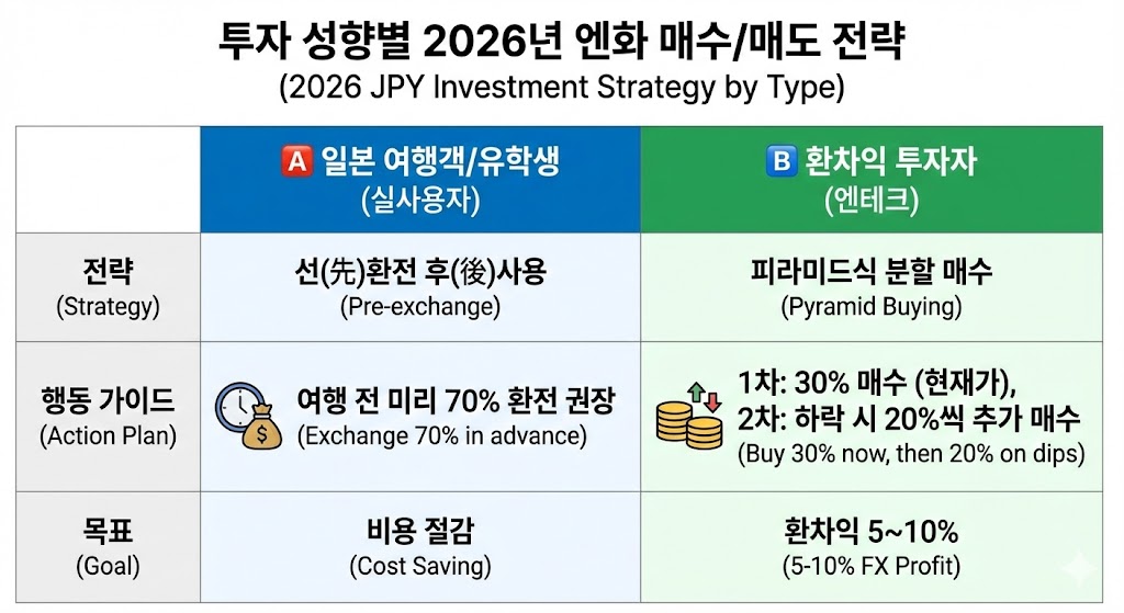 아래 표는 투자 성향(여행객 vs 환차익 투자자)에 따른 구체적인 매수/매도 행동 가이드를 정리한 것입니다.