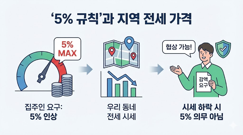 아래 이미지는 많은 세입자가 오해하는 '5% 인상 룰'이 절대적인 의무가 아니라는 점을 시각적으로 강조하는 가로형 인포그래픽입니다. 왼쪽의 '5% MAX' 게이지와 집주인의 요구 사항을 오른쪽의 '우리 동네 전세 시세' 하락 그래프와 대비시켜, 시장 상황에 따라 세입자가 당당하게 감액을 요구하고 협상할 수 있다는 메시지를 직관적으로 전달합니다.