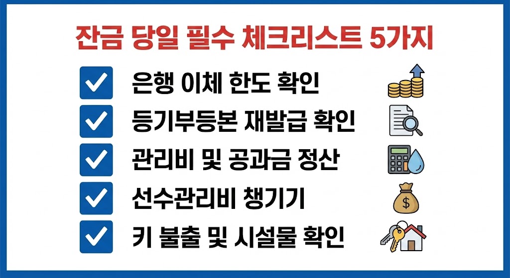 마지막으로, 잔금 지급 직전 확인해야 할 필수 항목 5가지를 요약한 체크리스트입니다.