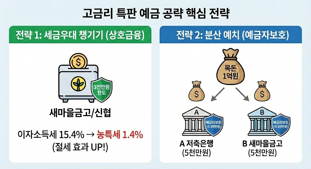 아래 이미지는 본문의 핵심 실전 전략 두 가지를 한눈에 보여주는 인포그래픽입니다. 왼쪽은 상호금융(새마을금고/신협)의 '세금우대' 혜택을 통해 이자소득세를 절약하는 방법을, 오른쪽은 예금자보호 한도를 고려하여 목돈을 여러 금융기관에 '분산 예치'하는 안전한 투자 방법을 도식화했습니다.
