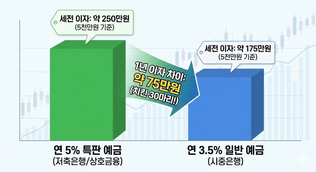 아래 이미지는 본문에서 강조한 '금리 1.5%p 차이'가 실제 이자 수령액에서 얼마나 큰 차이를 만드는지 직관적으로 보여주는 막대그래프 비교 인포그래픽입니다. 5천만 원을 예치했을 때 연 5% 특판과 연 3.5% 일반 예금의 세전 이자 차이가 약 75만 원(치킨 30마리 분량)에 달한다는 점을 시각적으로 강조하여, 독자들이 특판을 찾아야 할 확실한 동기를 부여합니다.